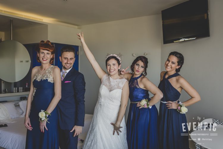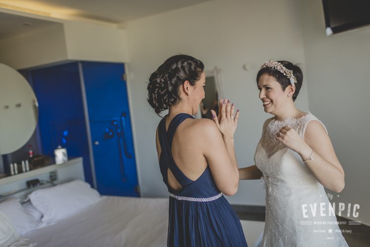 Laura eligió un edificio diferente para vestirse antes de la boda por aquello de no ver al novio momentos antes de la ceremonia, estando acompañada en todo momento por su familia más cercana y un grupo de amigos incondicionales que provocaron que Laura se sintiese muy cuidada en todo momento.