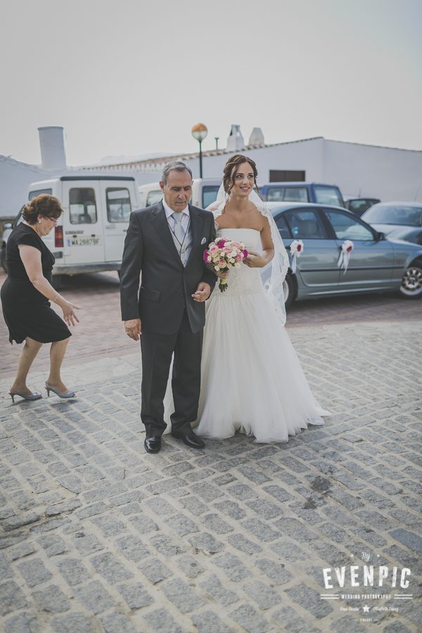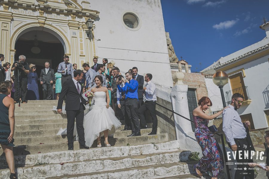 Al terminar los arreglos de Gracia nos dirigimos andando a la iglesia de Ardales, a escasos metros de la vivienda familiar, donde amigos y familiares aguardaban en el interior del templo con ilusión la llegada de la pareja de novios para verlos convertidos en Marido y Mujer.