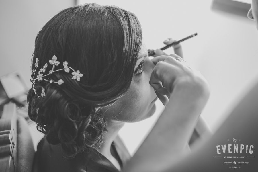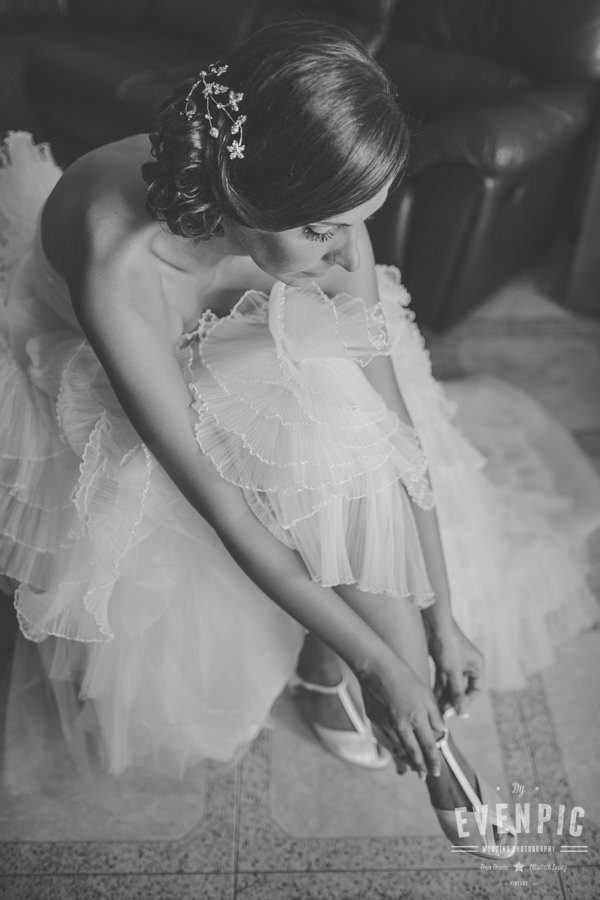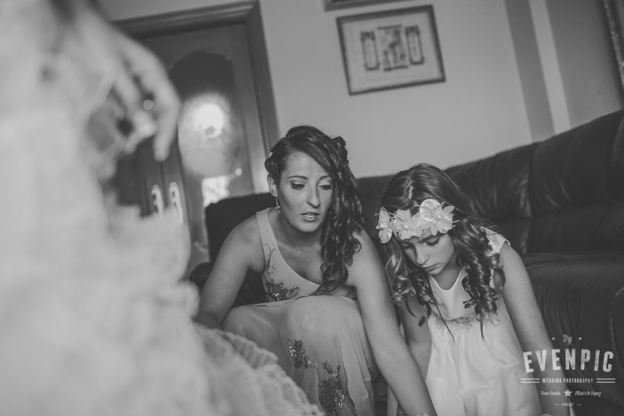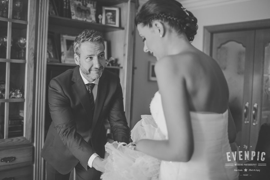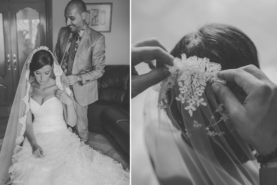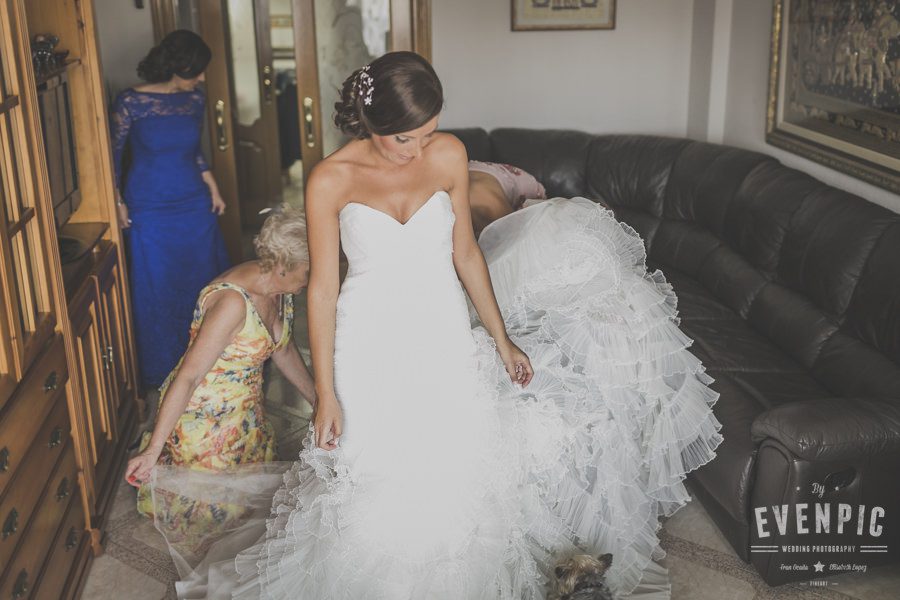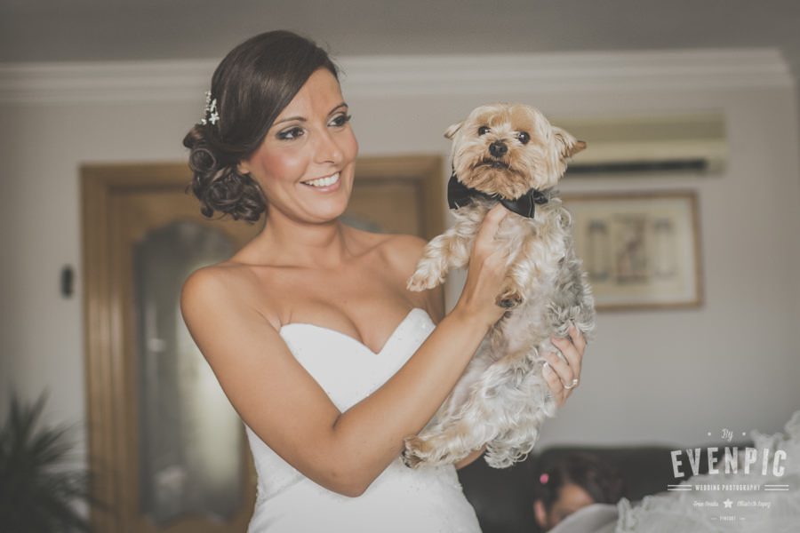 Rocio llevaba un traje de pronovias, se probó dos y al tercero, se le iluminó la cara porque sabia que ese era el suyo, y en efecto que asi era, sencillo, sensual y deslumbrante, asi es como le quedaba!!, el toque divertido lo dio su perrito, un yorkshire vestido para la ocasion con pajarita negra y que no dudo en hacerse hueco entre las fotos y tumbarse a los pies del vestido de la novia.
