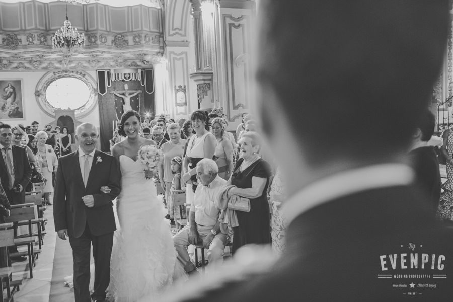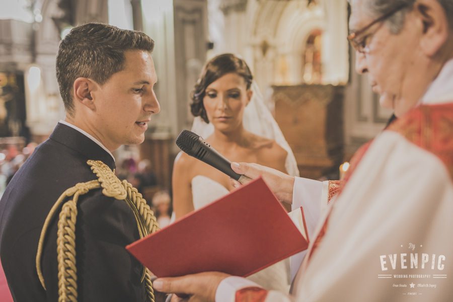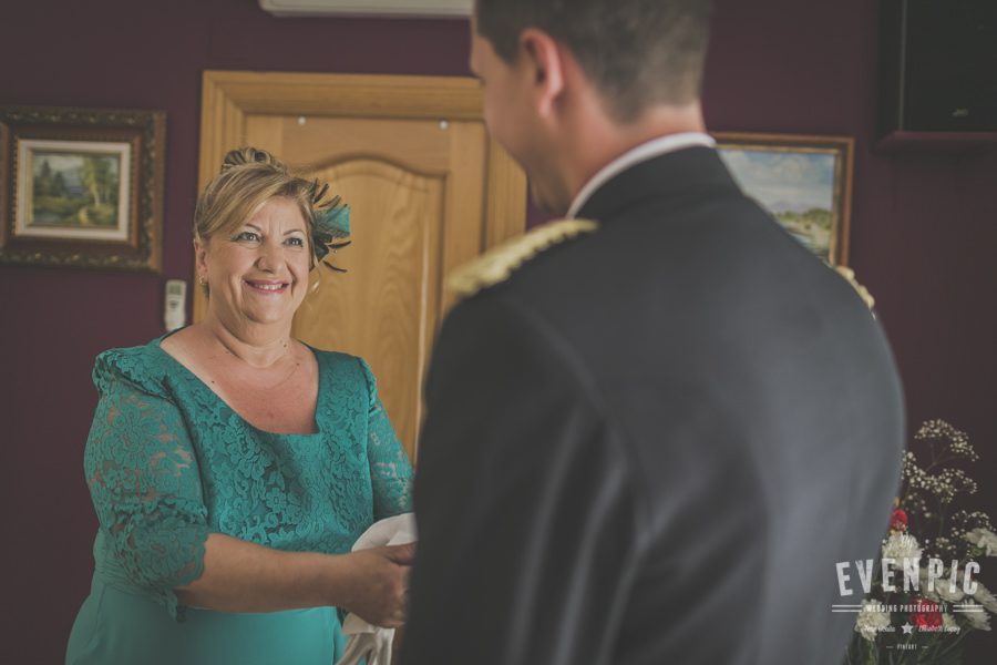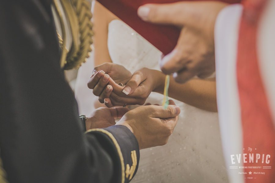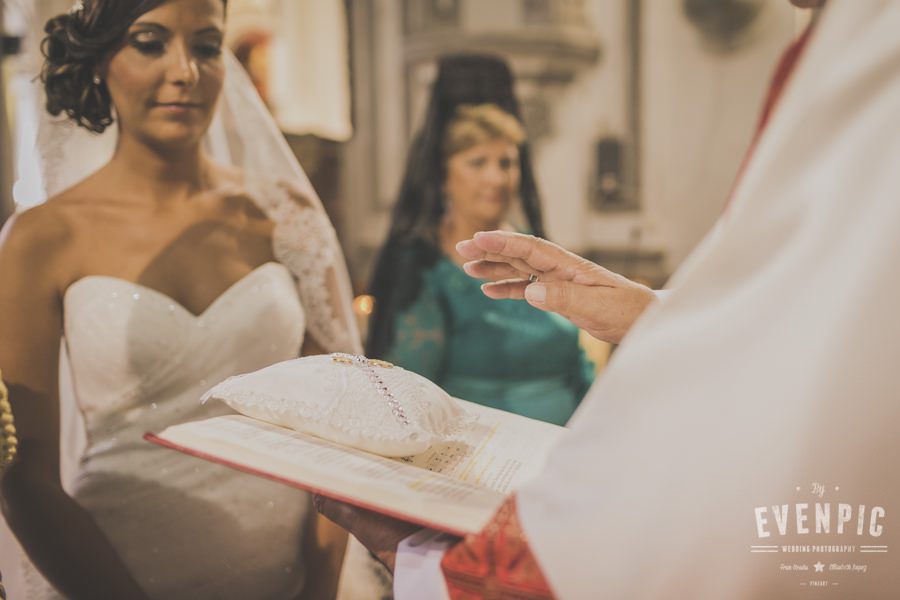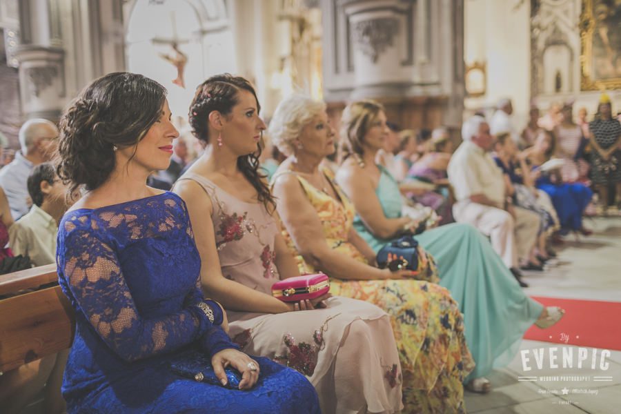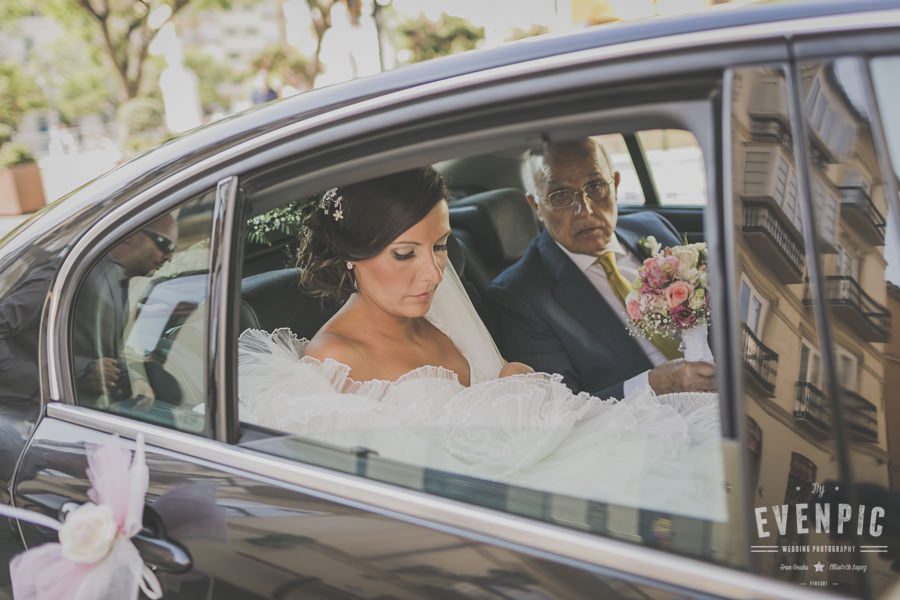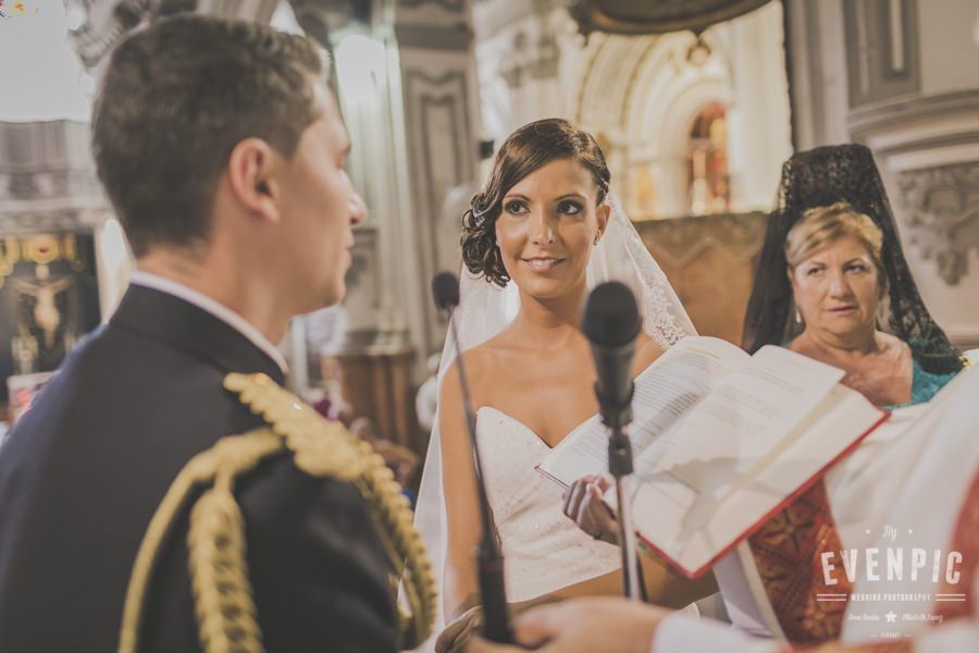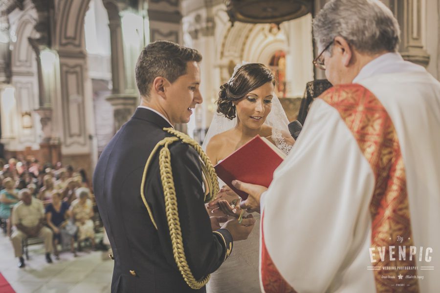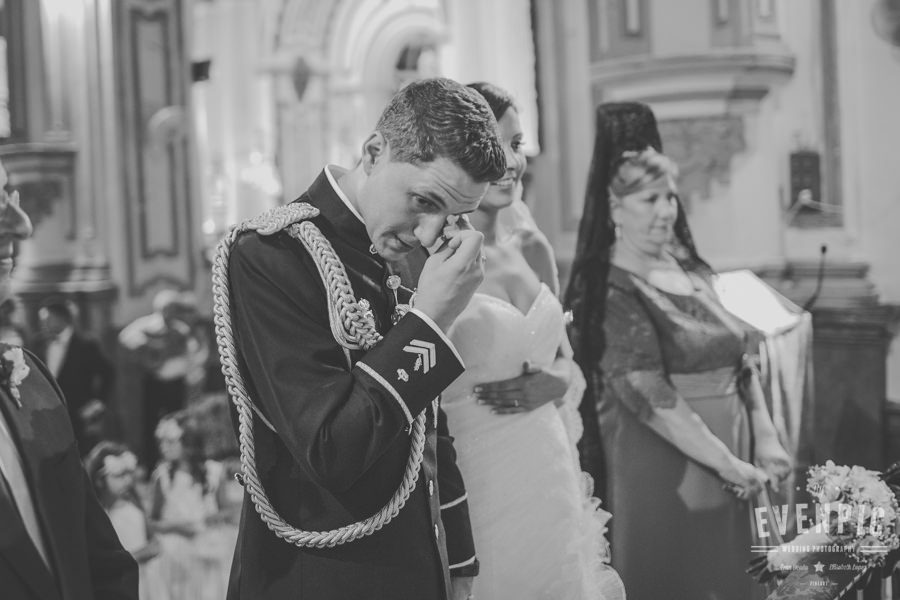 Una vez dejados los nervios atrás, nos dirigimos a la iglesia de Santiago Apostol. Eligieron esa iglesia para casarse por ser las mas antigua de Malaga, por estar alli el Cristo del Rico Patrón de la policía Nacional y también por ser la iglesia donde fue bautizado Picasso. Fue una ceremonia muy emotiva donde la sorpresa de un coro rociero emociono notablemente al novio y a su hermano.